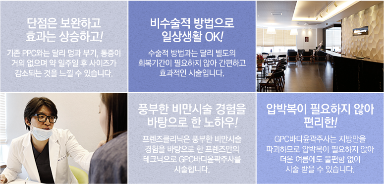 Äá¿¡¼ ÃßÃâµÈ GPC(Glyceryl Phosphoryl Choline)´Â PPC(PhosPhatidy Choline) Àü±¸¹°Áú·Î¼ ±¸Á¶ÀûÀ¸·Î´Â ±âÁ¸ PPCÀÇ ºÐÀÚ 2°³¿¡¼ Áö¹æ»êÀÌ ¶³¾îÁø PPC¿Í À¯»çÇÑ ¹°ÁúÀÔ´Ï´Ù. À̸¦ ÀÌ¿ëÇÑ GPC¹ÙµðÀ±°ûÁÖ»ç´Â PPC¿Í À¯»çÇÑ Àü±¸¹°ÁúÀÎ Äݸ° ¾ËÆ÷¼¼·¹ÀÌÆ®, L-Ä«¸£´Ïƾ µîÀ» »ç¿ëÇÏ¿© º¹ºÎ³ª Çã¹÷Áö, ÆÈ µîÀÇ Áö¹æ¼¼Æ÷°¡ ÁýÁßÀûÀ¸·Î ¸ô·Á ÀÖ´Â ºÎÀ§¿¡ ½Ã¼úÇÏ¿© Áö¹æÀ» °¨¼Ò½ÃÄÑÁÖ´Â ¿ªÇÒÀ» ÇÕ´Ï´Ù. GPC¹ÙµðÀ±°ûÁÖ»ç´Â ±âÁ¸ PPCÁÖ»ç½Ã¼úÀÇ ºÒÆíÇÔÀ¸·Î ²ÅÇû´ø ºÎÁ¾, ºÎ±â°¡ ÀûÀ¸¸ç 1´Þ¿¡ Çѹø ÁøÇàÇÏ¿´´ø PPCº¸´Ù GPC¹ÙµðÀ±°ûÁÖ»ç¿ä¹ýÀº 1ÁÖ¿¡ Çѹø¾¿ ȤÀº 2ȸ 3ȸµµ °¡´ÉÇÏ¸ç °³°³ÀÎÀÇ »óÅ¿¡ ¸ÂÃß¾î ½ºÄÉÁÙÀÌ ÁøÇàµË´Ï´Ù.
